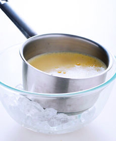 Montate i tuorli con lo zucchero rimasto nella casseruolina con la frusta, incorporando a filo il latte caldo. Cuocete la crema a fuoco bassissimo, finché velerà il cucchiaio. Spegnete, scioglietevi la gelatina sgocciolata e strizzata e posate la casseruolina su una ciotola con ghiaccio per raffreddarla velocemente. Montate la panna ben fredda e incorporatela delicatamente alla crema.