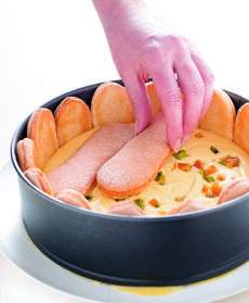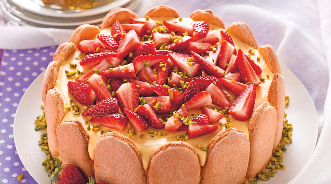 Create uno strato di savoiardi intinti nel Porto sul fondo dello stampo, lasciando liberi 2 cm lungo il bordo. Tagliate gli altri savoiardi a metà, inzuppateli nel Porto e allineateli in verticale lungo il bordo. Versate 1/3 della crema, unite 1/3 del croccante e proseguite con strati di savoiardi, croccante e crema. Mettete la charlotte in frigo per 4 ore, poi sformatela e decoratela con le fragole tagliate a spicchi e, se vi piace, granella di pistacchi.