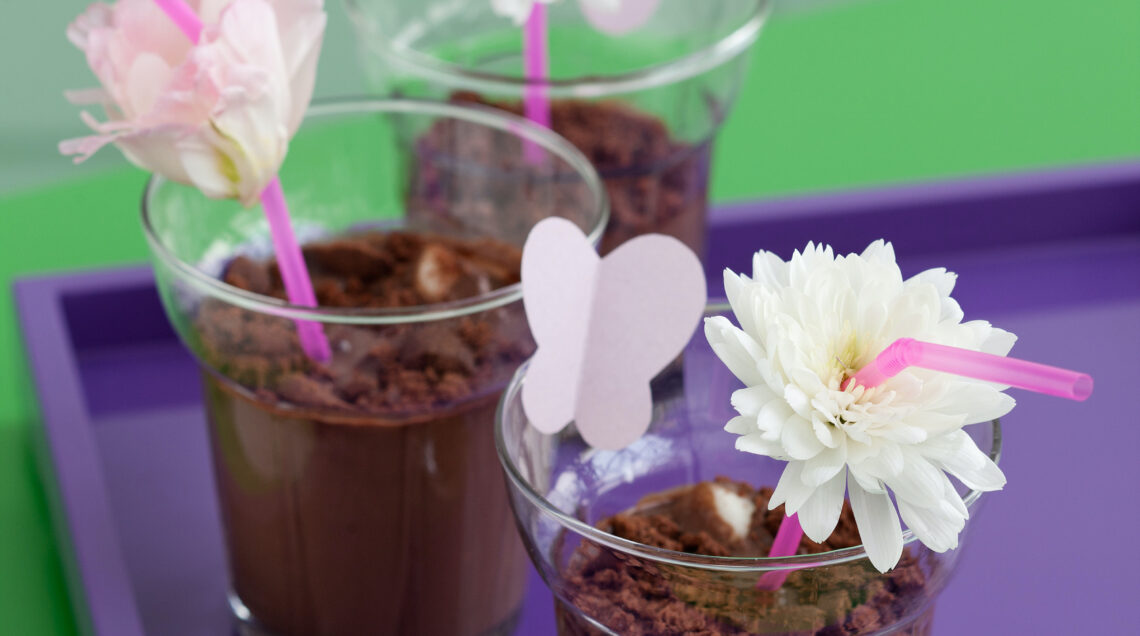 3) Sbucciate la pera (o la mela) e tagliatela in 4 spicchi, scartando i semi e i torsoli. Infilzate una cannuccia in ogni spicchio di frutta e immergete le cannucce nei vasetti di crema. Decorate ogni cannuccia con un fiore e coprite la superficie della crema con i biscotti al cioccolato, sbriciolati grossolanamente con le mani.