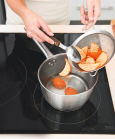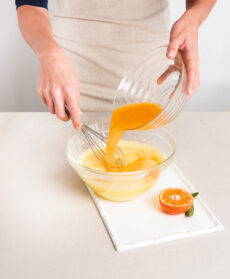 Ricavate le scorze di tre clementine e sbollentatele per 2 volte rinnovando l'acqua ogni volta per togliere l'amaro. Quindi bollitele per 15 minuti con 80 g di zucchero e 200 ml d'acqua. Tagliate le scorze a striscioline e tenete da parte il tutto.