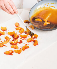 Preparate uno sciroppo con 10 ml di succo di clementine, 10 g di zucchero e il restante liquore. Tagliate il pan di Spagna a fette di 1 cm tenendone da parte 2 fettine, e spennellate le altre con lo sciroppo. In una coppa, formate strati alternati di pan di Spagna e mousse di clementine cospargendo con le striscioline di scorza. Terminate con uno strato di mousse e mettete in frigo per una notte. Ricavate gli spicchi di 3 clementine e portateli a ebollizione nello sciroppo di cottura delle scorze, poi scolateli e metteteli da parte. Versate 80 g di zucchero in una padella, aggiungete gli spicchi e fateli caramellare per 1-2 minuti. Depositateli su carta da forno.
