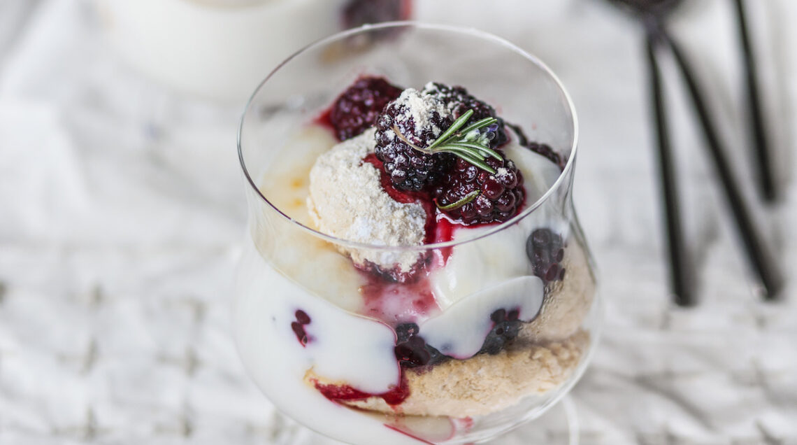 Un dessert vegano dai colori eleganti, che abbina ingredienti mediterranei e delizie dell'orto e del sottobosco. Preparato con latte di mandorla e zucchero di canna
