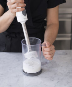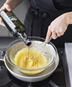 Mescolate i tuorli con lo zucchero di canna e montateli con una frusta a bagnomaria insieme al Porto finché avranno raddoppiato il loro volume.