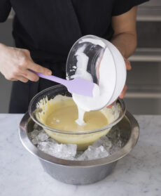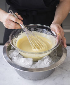 Unite la gelatina ammorbidita in acqua fredda, scolata e strizzata e lasciate raffreddare la ciotola con il composto in un'altra ciotola, meglio se d'acciaio, piena di cubetti di ghiaccio fino a quando avrà raggiunto la temperatura di 45°.