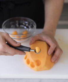 Per le palline di melone marinate: tagliate a metà il melone, privatelo dei semi e della scorza e ricavate dalla polpa tante palline con l'apposito attrezzo; raccoglietele in una ciotola, cospargetele con lo zucchero di canna e la scorza di lime grattugiata, mescolate e lasciate marinare per 20 minuti.
