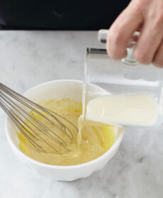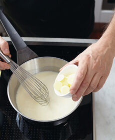 Versate in una casseruola il resto del latte e dello zucchero. Unite la scorzetta di limone e quella d'arancia e portate a bollore. Aggiungete il burro, fatelo sciogliere mescolando.