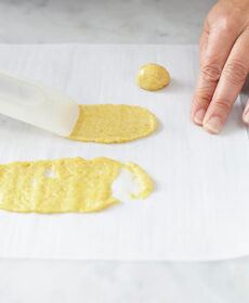 Per la crema, setacciate in una ciotola la farina e l'amido di mais, unite lo zafferano, l'agar agar, un pizzico di vaniglia, 1 cucchiaio di zucchero e mescolate. Versate sopra, poco alla volta, 100 grammi di latte di soia, mescolando bene con una frusta.