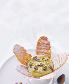 Per le cialde, mescolate in una ciotola la farina con olio di girasole, sciroppo d'acero, bicarbonato, zafferano, vaniglia e 0,25 dl d'acqua. Formate palline grandi quanto una nocciola e stendetele su 2 o più fogli di carta da forno, servendovi di una spatola, per ottenere petali allungati e sottili: ne otterrete 15-20. Trasferite su 2 o più placche, cuocete le cialde in forno a 180° per 10-12 minuti e fate raffreddare. Dividete la crema in 4 coppe, disponete intorno le cialde, decorate con i pistacchi e il cioccolato a scaglie e servite (disponete e le cialde intorno alla crema poco prima di servire per garantirne la massima friabilità).