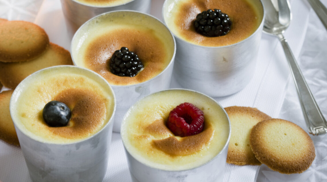 3) Estrai i cremini al mascarpone dal forno, decorali con i frutti di bosco che hai tenuto da parte e poi gustali tiepidi insieme a dei biscotti sottili e friabili.