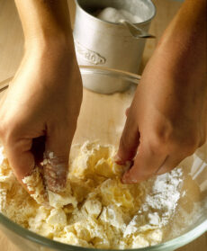Mettete la farina setacciata in una ciotola e mescolatela con lo zucchero rimasto. Aggiungete il burro molto freddo, appena tolto dal frigorifero, a pezzetti, e impastate gli ingredienti velocemente con la punta delle dita, fino a ottenere un composto sbriciolato.