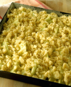 Distribuite il composto sbriciolato sulle mele. Cuocete in forno a 180° per 30 minuti o finché la crosta risulterà dorata e croccante. Sfornate e fate intiepidire. Servite il crumble direttamente dalla teglia, tiepido o freddo, usando un cucchiaio.