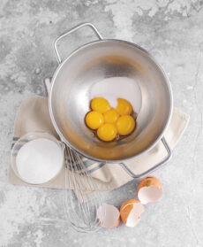 Sbattete con la frusta i tuorli freschissimi in una casseruola. Unite lo zucchero e sbattete ancora finché il composto risulta ben montato e soffice.