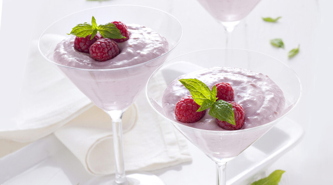 Suddividete il composto nei bicchieri e trasferitelo in frigorifero per almeno 4 ore. Sciacquate i lamponi in un colino a maglie fitte, poi fateli asciugare stesi, allargati su fogli di carta da cucina. Al momento di servire, decorate la superficie delle mousse con lamponi e foglioline di menta.