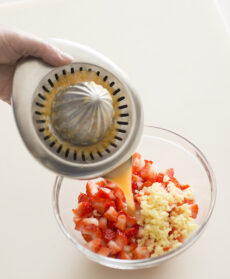 Mettete a bagno la gelatina in una ciotola con abbondante acqua fredda per 10 minuti. Lavate le fragole, asciugatele delicatamente tamponandole con carta da cucina, eliminate la corona di foglioline e tagliatele a tocchetti (lasciatene qualcuna intera per la decorazione); trasferiteli in una ciotola con il succo dell'arancia e lo zenzero, sbucciato e grattugiato molto finemente.