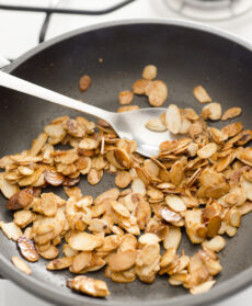 Poco prima di servire, fate tostare per qualche istante le lamelle di mandorle in un padellino antiaderente con lo zucchero di canna rimasto. Guarnite le mousse con le fragole tenute da parte, tagliate a fettine, le mandorle tostate e servite.