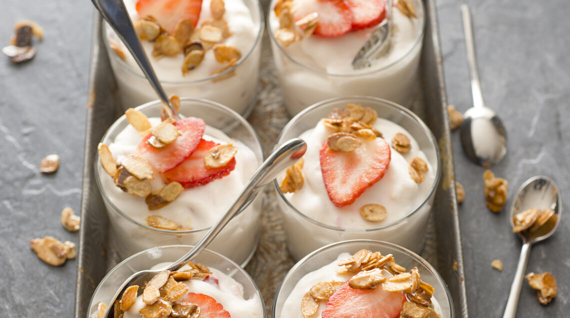 Un dolce al cucchiaio profumato, preparato con formaggio spalmabile e fragole fresche. Il tocco croccante è quello delle mandorle caramellate