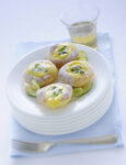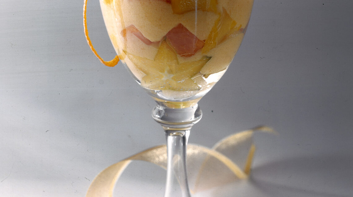 2 Sbattete 4 tuorli con 125 g di zucchero fino a quando risultano chiari e spumosi, incorporateli a filo con il miscuglio di latte e succo ancora caldi, metteteli sul fuoco a bagnomaria e cuocete per circa 10 minuti, fin quando la crema si sarà leggermente addensata.