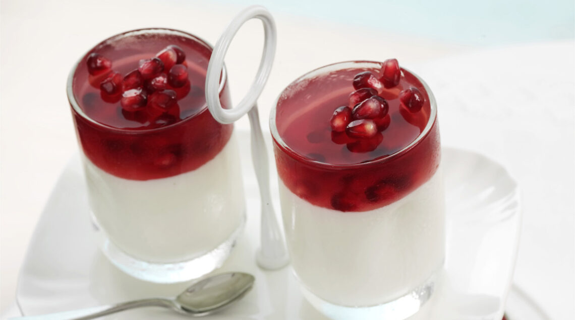 L’ingrediente chiave di questa ricetta è la gelatina in fogli che si usa per addensare sia la panna che la copertura di succo di melagrana. Sebbene sia nota come colla di pesce, al giorno d’oggi è ricavata da gelatine animali restando, naturalmente, inodore e incolore. Per saperne di più si questo prodotto, leggete il nostro articolo sugli utilizzi della gelatina in fogli, con i consigli della nostra home economist Claudia Compagni, che è anche l’autrice di questa ricetta.