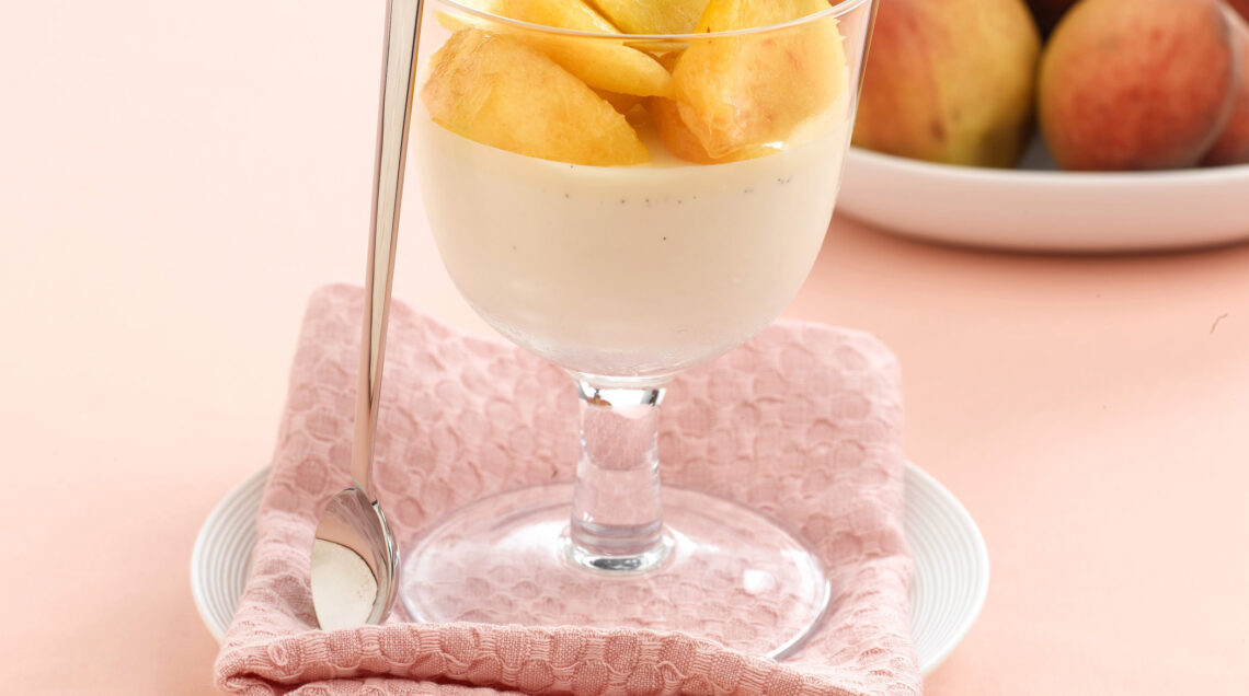 3) Al momento di servire completa la panna cotta con le pesche e qualche foglia di menta.