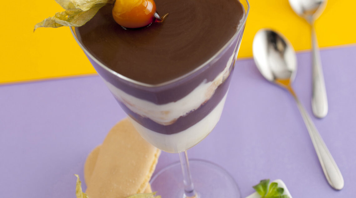 4) Ripeti le operazioni con i rimanenti ingredienti e tieni i bicchieri in frigorifero per 4-5 ore. Prima di servire, prepara un caramello chiaro con il restante zucchero e 1 cucchiaino di acqua, caramella gli alkechengi e decora.