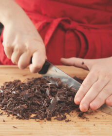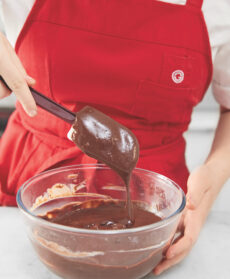 Togliete la crema inglese dal fuoco, versatela sul cioccolato a scaglie, coprite la ciotola con la pellicola e, quando il cioccolato sarà sciolto, mescolate molto bene. Fate raffreddare la crema in frigorifero coperta con pellicola a contatto.