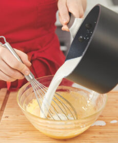 Quando il latte e la panna saranno quasi a bollore, togliete la bacca di vaniglia e versate il liquido sui tuorli stemperandoli bene. Rimettete tutto sul fuoco e, sempre mescolando, a fuoco molto basso, continuate a cuocere per circa 5 minuti fino a quando la crema inglese velerà il cucchiaio (se avete il termometro la temperatura dovrà raggiungere 82°).