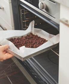 Fate il crumble: in una ciotola riunite la farina, il cacao amaro, lo zucchero di canna e un pizzico di sale. Aggiungete il burro freddo a tocchetti e, con la punta delle dita, create un composto a briciole. Sistematele su una teglia rivestita di carta da forno e infornate per 20 minuti a 180° in modalità statica. Sfornate e lasciate raffreddare.