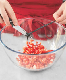 Tagliate le fragole a tocchetti molto piccoli e mettetele a macerare per 20 minuti con 2 cucchiai di zucchero e i semini di vaniglia rimasti.