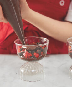 Montate il parfait nelle coppe: fate uno strato di crumble, poi uno di cremoso al cioccolato, uno di fragole ben scolate e ripetete daccapo i tre strati. Guarnite con un po' di cioccolato a scaglie.