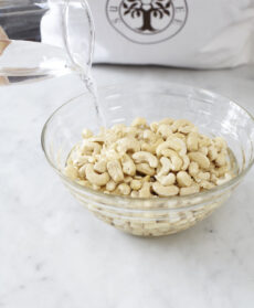 Mettete a bagno gli anacardi per 20 minuti in acqua a temperatura ambiente. Scolateli e tritateli nel mixer.