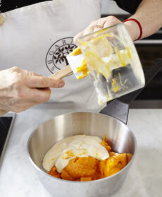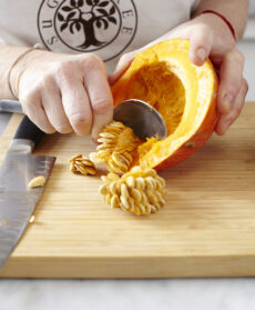 Private la zucca dei semi, tagliatela a tocchi e cuocetela a vapore per circa 15 minuti. Frullate la banana con il succo del lime. Private i tocchi di zucca della scorza e riducete in purea la polpa (devono essere circa 250 g) con il mixer o il frullatore.