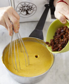 Togliete la crema dal fuoco e unite il latte di cocco, l'uvetta, gli anacardi, le spezie macinate e i due tipi di zenzero. Mescolate e servite la crema tiepida o fredda, se vi piace guarnita da ciuffi di purea di zucca.