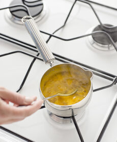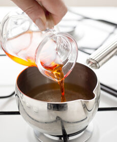 Versate il bicchiere di Aperol e quello di Prosecco in un pentolino con 2 cucchiai di zucchero semolato e fate ridurre a fuoco medio a un po' più della metà, mescolando di tanto in tanto con il cucchiaio di legno.