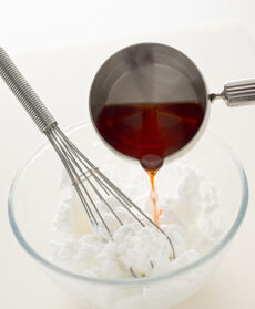 Montate gli albumi a neve ben ferma con un pizzico di sale e 2 cucchiai abbondanti di zucchero a velo setacciato, utilizzando la frusta; poi versate a filo la riduzione di Aperol e Prosecco ben calda. Montate anche la panna con la frusta e incorporatevi gli albumi all'Aperol; mescolate delicatamente dal basso verso l'alto.