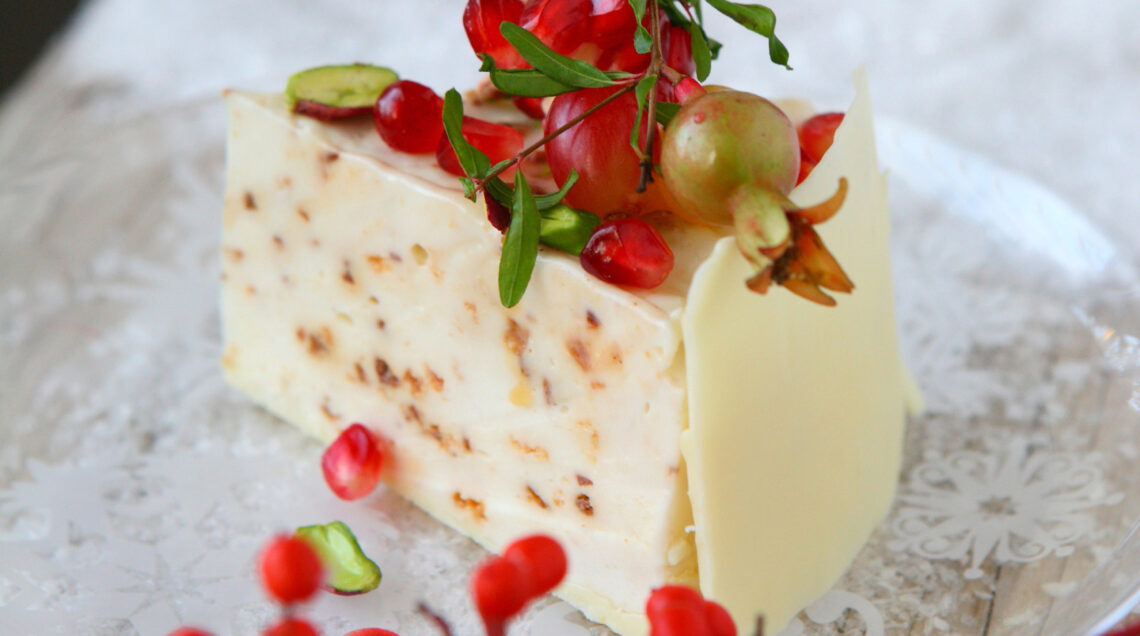 3 Versate il composto nello stampo e poni in freezer a gelare per almeno 6 ore. Al momento di servire aprite lo stampo e staccate molto delicatamente la carta dal cioccolato. Guarnite la torta con la melagrana, i chicchi d'uva e i pistacchi divisi a metà. Per tagliarla, scaldate prima la lama nell'acqua calda.