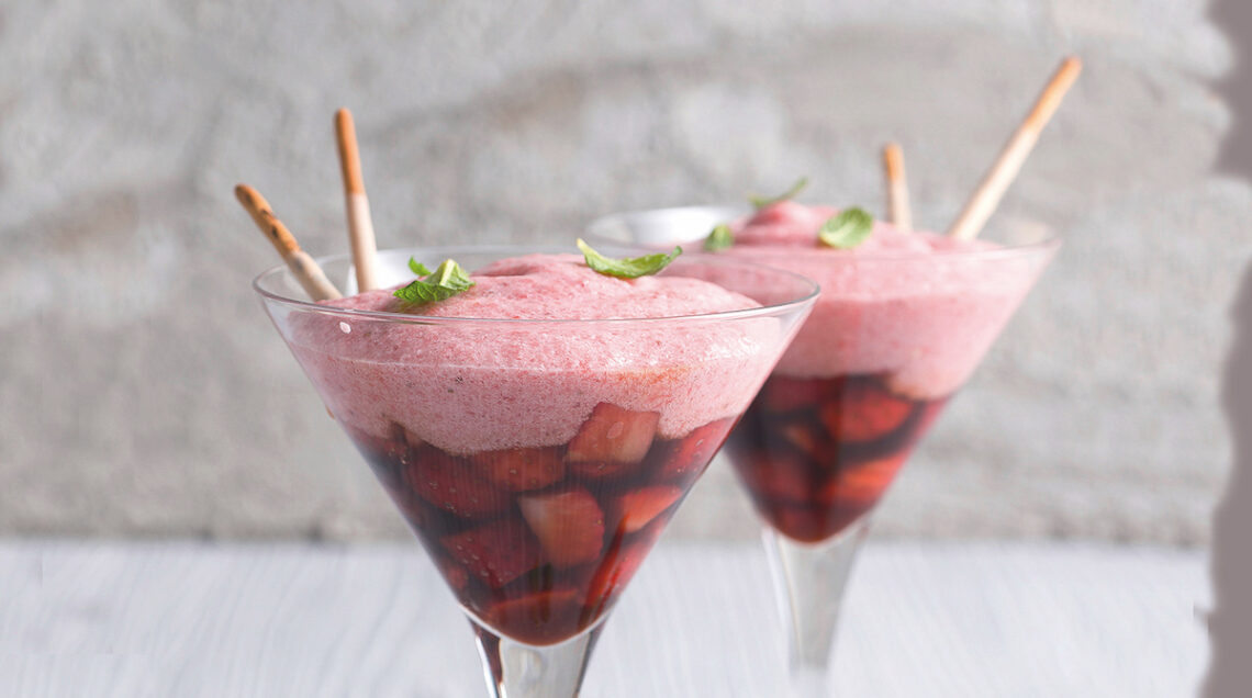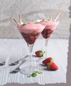 Distribuite le fragole al balsamico in 6 coppe o bicchieri e colmatele con il sorbetto ottenuto; guarnitele infine con 2-3 biscotti tipo Mikado e qualche fogliolina di menta e servite.