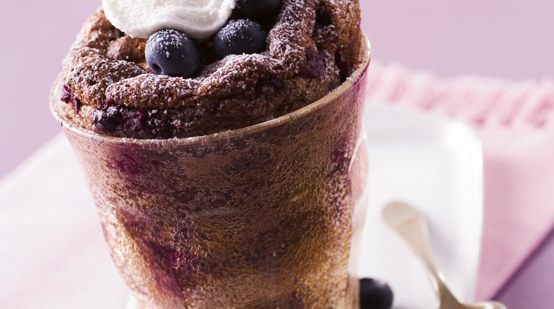 5) A fine cottura lascia riposare i soufflé per alcuni minuti dentro il forno, poi servili ancora caldi guarniti con mirtilli e panna.