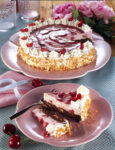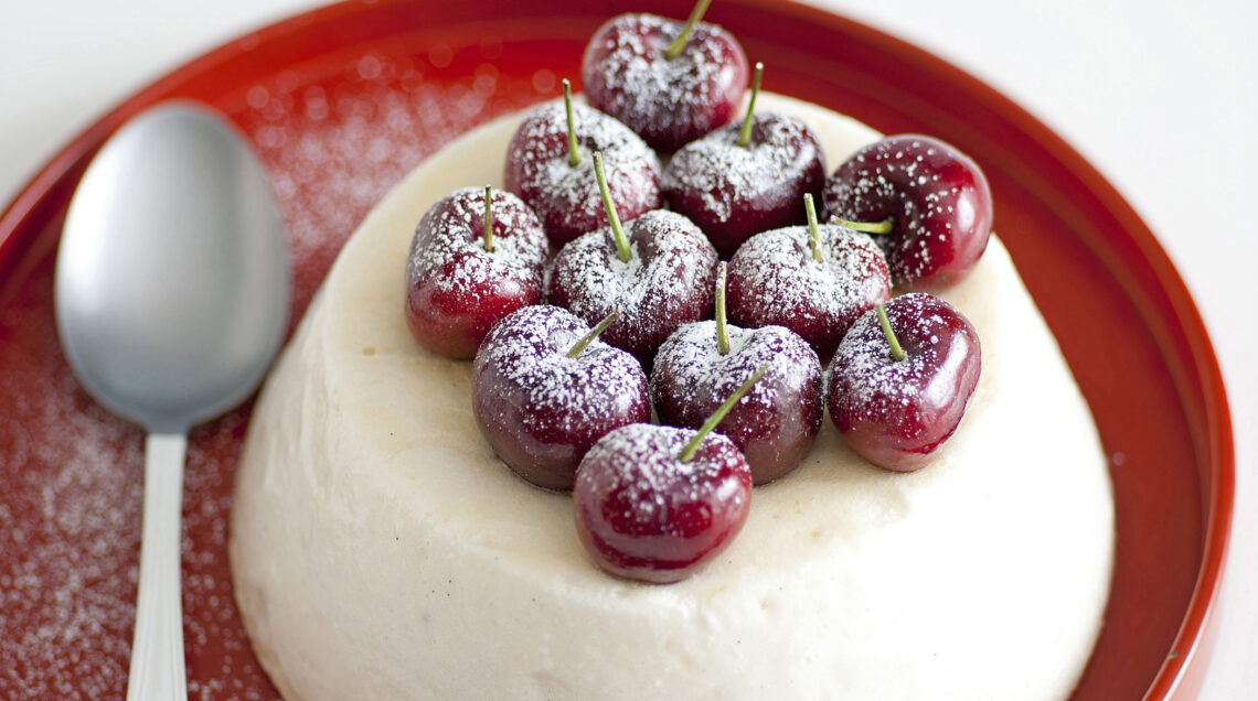 4) Unisci anche la gelatina, frulla per qualche secondo e versa il composto in uno stampo da charlotte di 1 litro di capacità, con il fondo rivestito da un disco di carta da forno. Trasferisci lo stampo in frigo per almeno 4 ore, sforma il dolce e completa con le ciliegie lavate, lo zucchero a velo e la cannella.