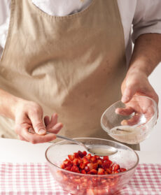 Sciacquate delicatamente le fragole in una ciotola piena d'acqua, scolatele e privatele del picciolo. Separate quelle più morbide da quelle sode e riducete queste ultime a cubettini, raccogliendoli in una ciotola. Spremete il succo di 1/2 limone, stemperatevi 40 g di zucchero extrafine e unite i semini della vaniglia raschiati dal baccello. Cospargete il mix sui cubetti di fragola, mescolando delicatamente per non romperli. Lasciate riposare.