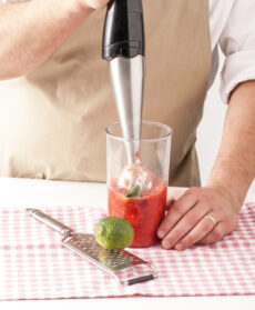 Preparate il coulis: riducete le restanti fragole a pezzettoni e raccoglieteli nel bicchiere del mixer; unite la buccia di 1/2 lime grattugiata, il succo del lime, lo zenzero sbucciato e grattugiato e lo zucchero rimasto. Frullate e lasciate macerare con 2-3 di foglie di menta.
