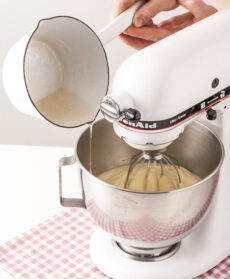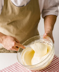Preparate la crema: mettete le uova e il tuorlo nella planetaria e iniziate a montare a velocità media con appena un pizzico di sale. Intanto, mettete lo zucchero in un pentolino con 40 ml d'acqua e 40 ml di maraschino, scaldate sul fuoco e portate a 120°. Versate subito a filo sulle uova e finite di montare completamente.
