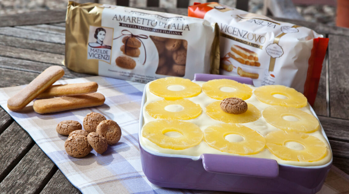 Iniziate quindi la creazione del vero e proprio tiramisu: preparate una base di savoiardi imbevuti di succo d’ananas.