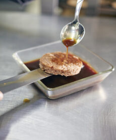 L'incontro tra il cacao amaro e la curcuma è già un insolito biglietto da visita per questo classico della pasticceria, realizzato in chiave vegana. Un dolce al cucchiaio morbido e profumato