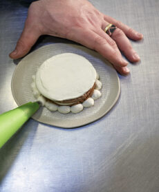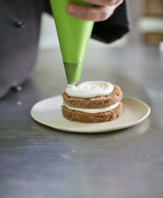 Trasferite la crema in una tasca da pasticciere con bocchetta liscia. Disponete 10 dischetti su altrettanti piattini di servizio, coprite con uno strato di crema e con i dischetti rimasti. Formate uno strato di crema sulla superficie e livellate con una spatola.