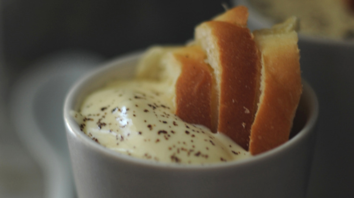 2 Mettete il panbiscotto (o le fette biscottate) sul fondo di una pirofila o in 4 coppette monoporzione, bagnate a piacere con la Sambuca rimasta e coprite con la crema preparata.