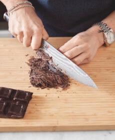 Con un coltello affilato tagliate e riducete in scaglie il cioccolato.