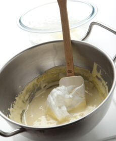 In un'altra casseruolina, mettete gli albumi con lo zucchero a velo. Appoggiate il recipiente sul bagnomaria e iniziate a sbattere energicamente con una frusta a mano, finché gli albumi risulteranno ben montati, densi e lucidi. Incorporateli alla crema di rum. Quando il composto sarà freddo, amalgamate la panna montata, con movimenti delicati dal basso verso l'alto, per non smontarla.