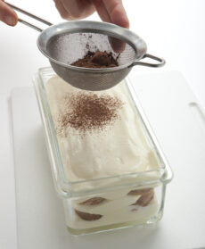 Spolverizzate il tiramisù con il cacao passato attraverso un colino a maglie fitte, copritelo con un foglio di pellicola e ponetelo in freezer per 5-6 ore. Lasciatelo a temperatura ambiente per 25-30 minuti, prima di servire.