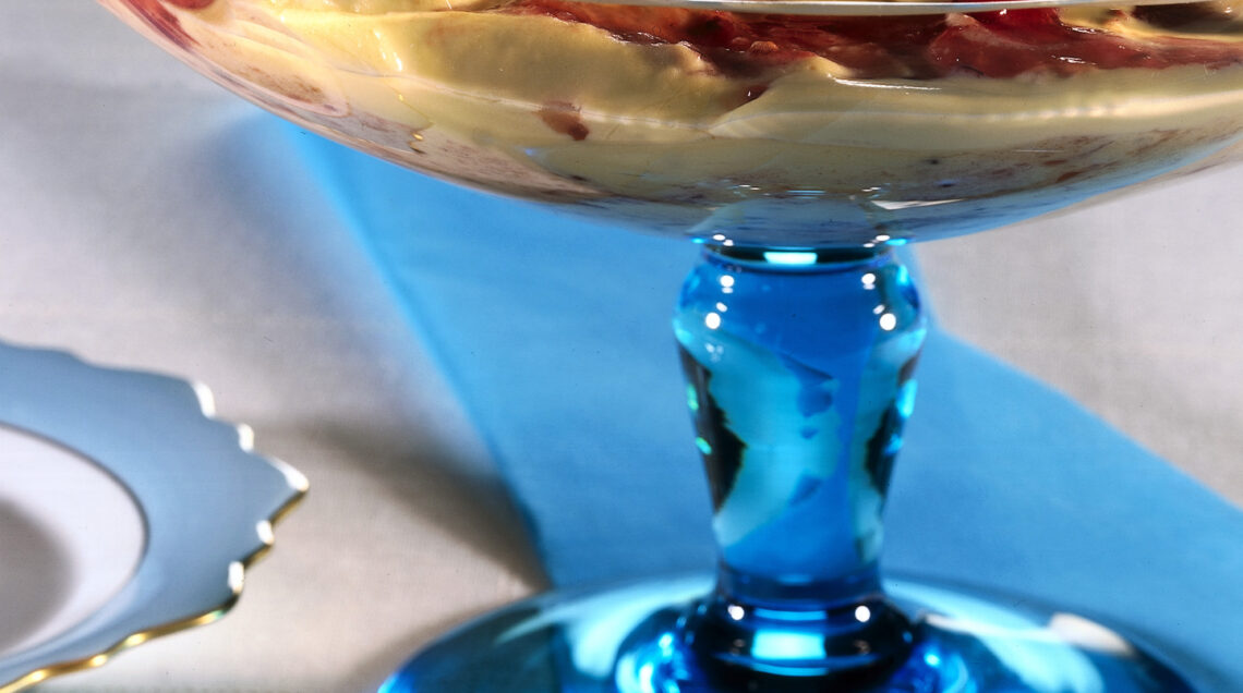 4) Aggiungi le ciliegie con il loro sciroppo di cottura, mescola delicatamente e copri il composto con la crema inglese. Conserva il trifle (il dolce della tradizione anglosassone da cui deriva la nostra zuppa inglese alla frutta) al fresco e servi a temperatura ambiente.