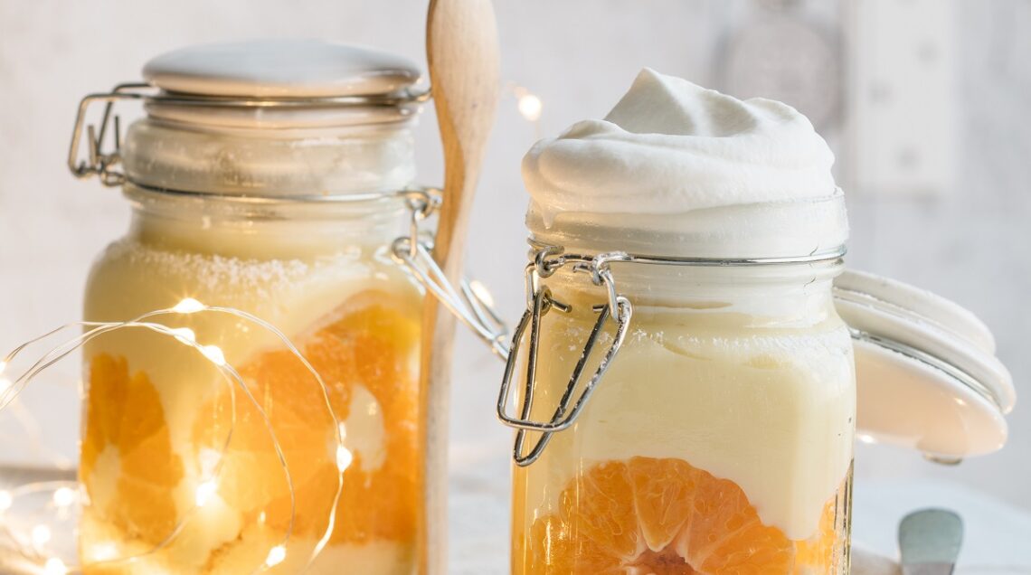 Questo dolce dalle note agrumate, a base di pan di Spagna e una golosa crema preparata con latte di mandorle, è guarnito con ciuffi di panna montata. Le monoporzioni sono perfette alla fine di un pranzo importante.